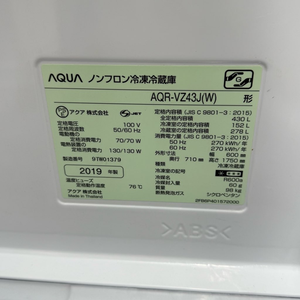 430L 4ドア冷蔵庫 アクア AQR-VZ43J-W 2019年製 右開き クリアウォームホワイト 世帯用 ファミリー