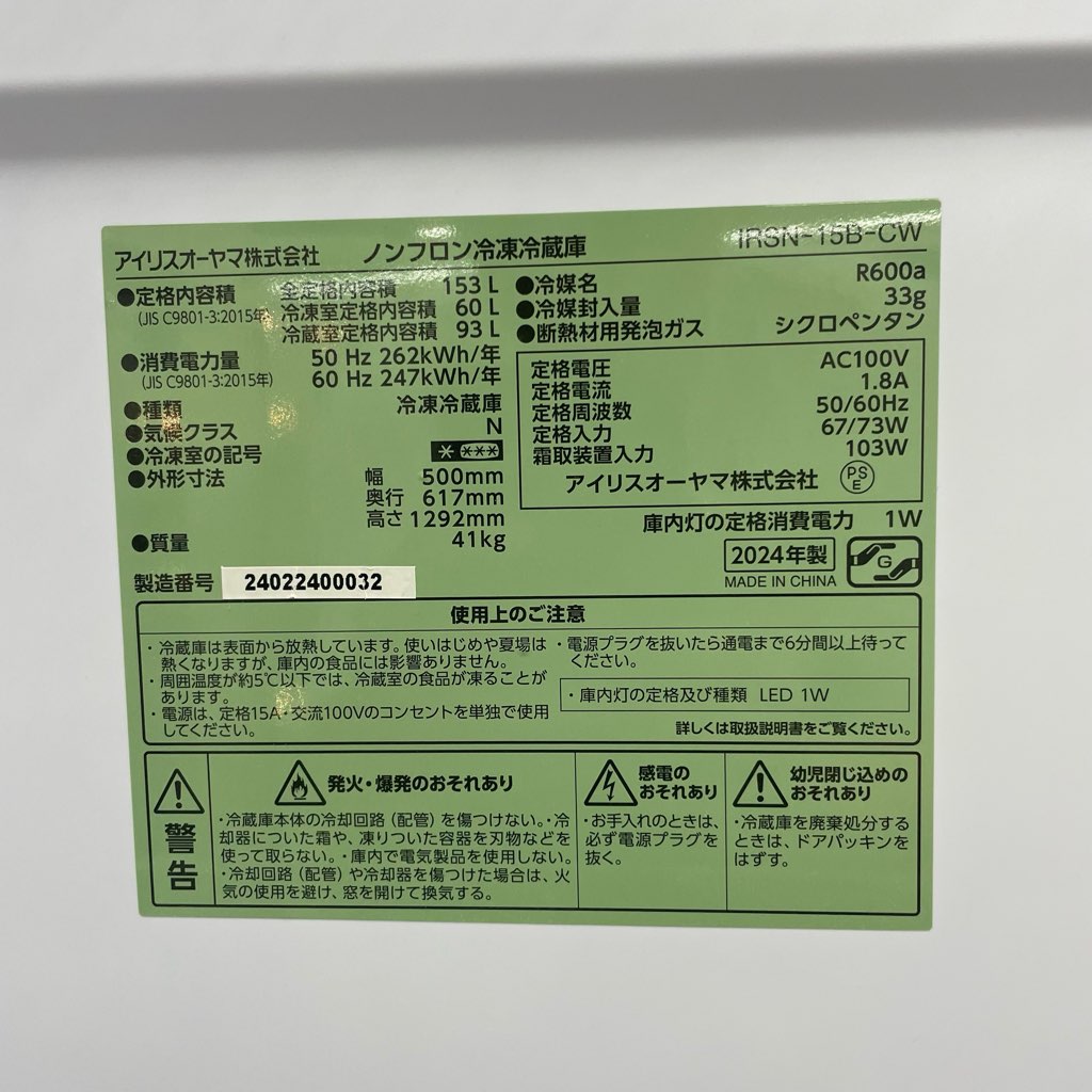 153L 2ドア冷蔵庫 アイリスオーヤマ IRSN-15B-CW 2024年製 ホワイト ボトムフリーザー 新生活 二人暮らし