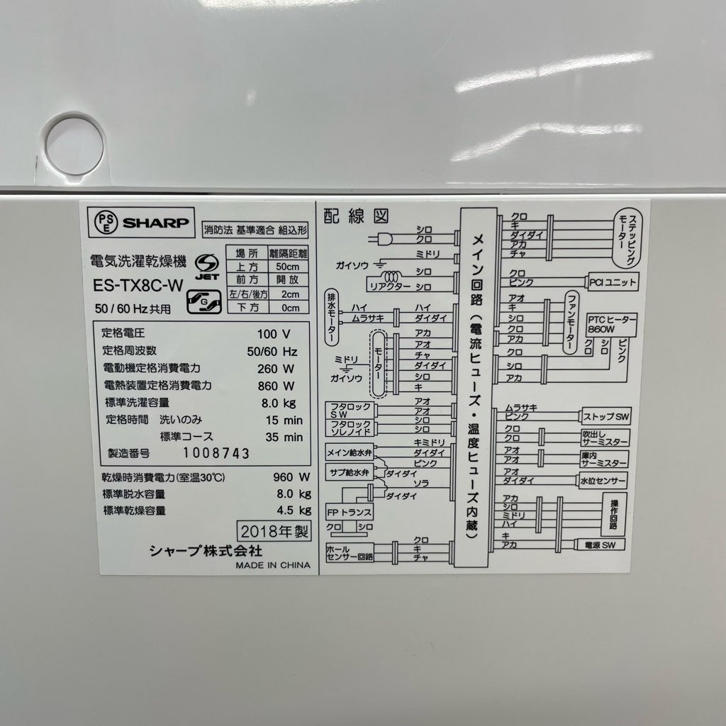 洗濯8.0kg 乾燥4.5kg 縦型洗濯乾燥機 シャープ ES-TX8C-W 2018年製造 ホワイト