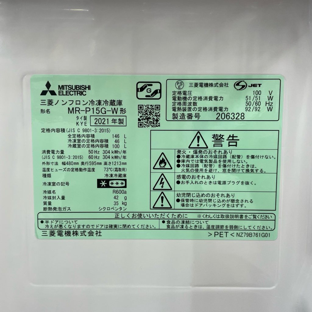146L 2ドア冷蔵庫 三菱電機 MR-P15G-W 2021年製 自動霜取りファン式 マットホワイト 一人暮らし 単身用