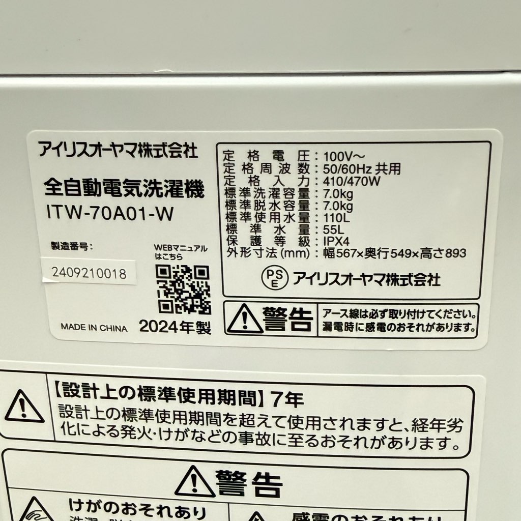 アイリスオーヤマ 7.0kg 全自動洗濯機 簡易乾燥機能 ITW-70A01-W 2024年製 ホワイト 一人暮らし 二人暮らし