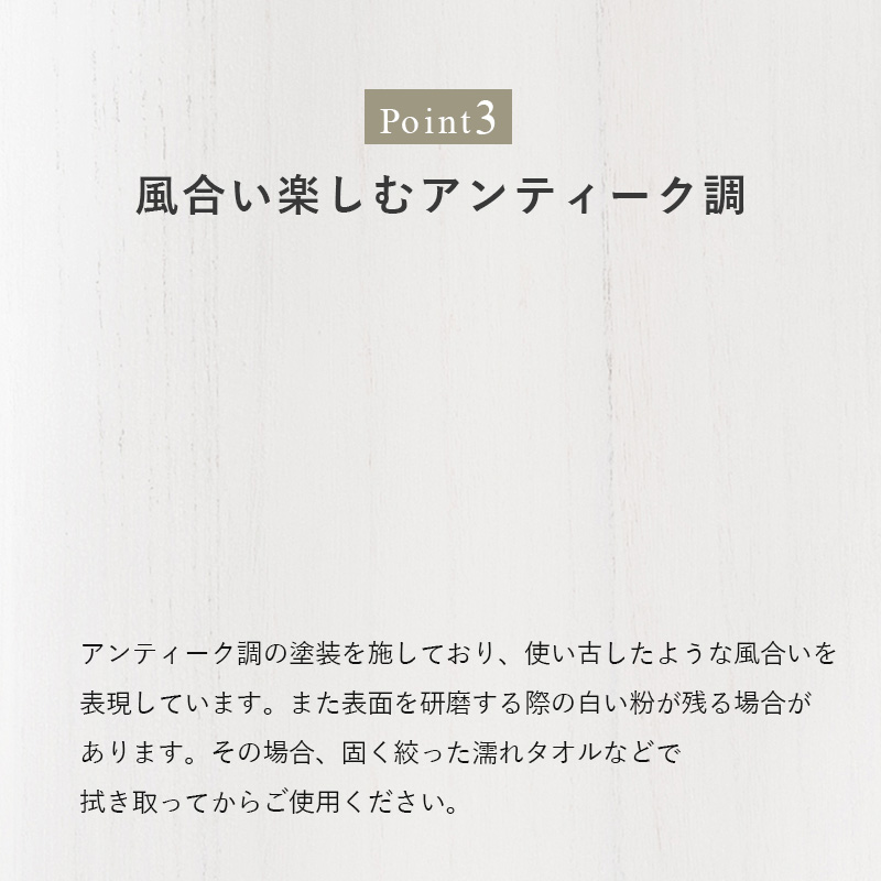 アンティーク調の塗装を施しており、使い古したような風合いを表現しています。また、表面を研磨する際の白い粉が残る場合があります。その場合、固く絞った濡れタオルなどで拭き取ってからご使用ください。