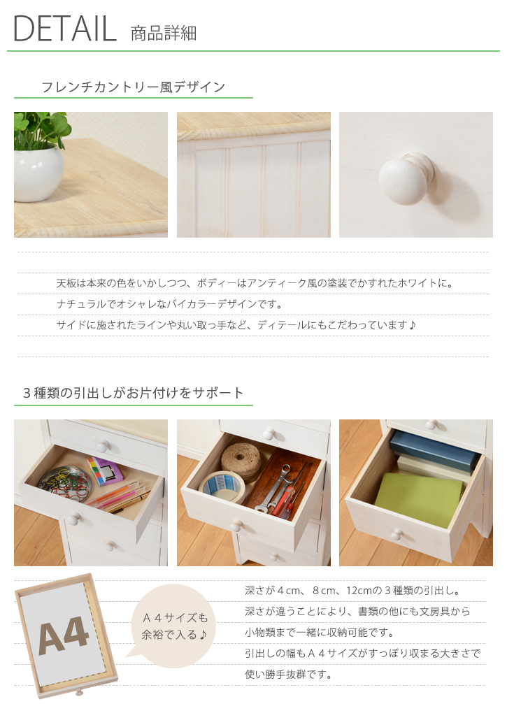 シャビーホワイトの本体に、アンティーク調ナチュラルな天板が映えるシンプル書類チェストです。