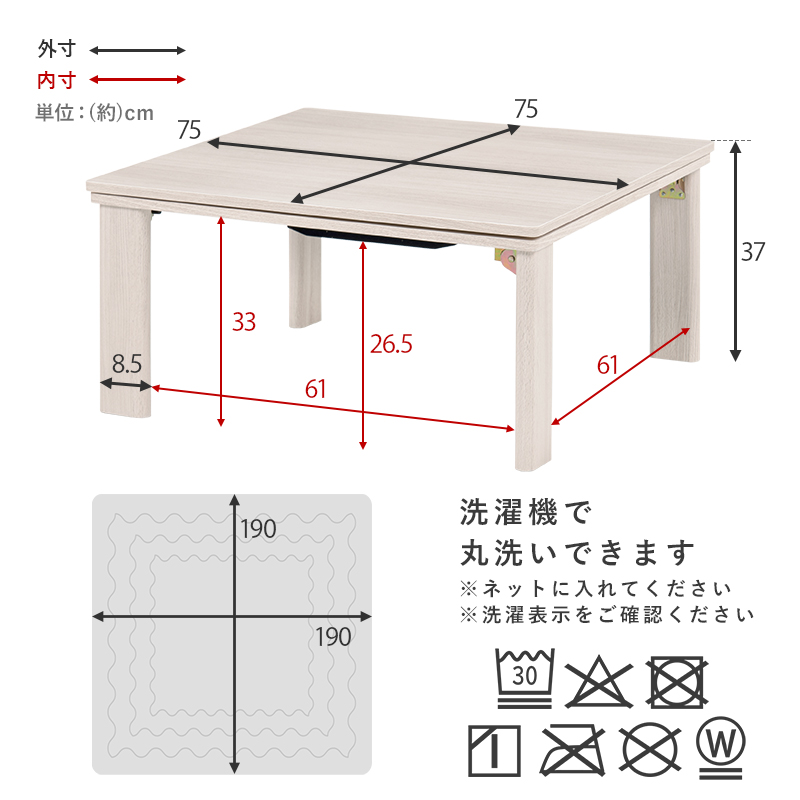 こたつ:(約)幅75×奥行75×高さ37cm