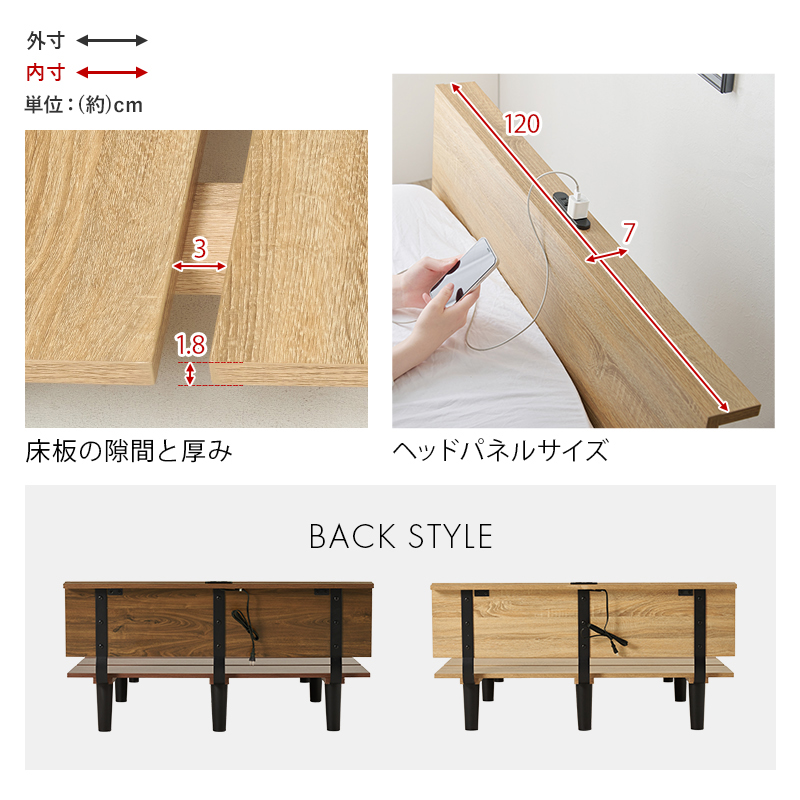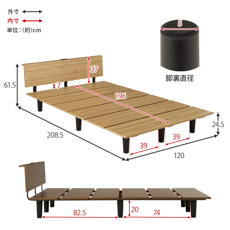 ベッド:(約)幅120×奥行208.5×高さ61.5×床面高24.5cm