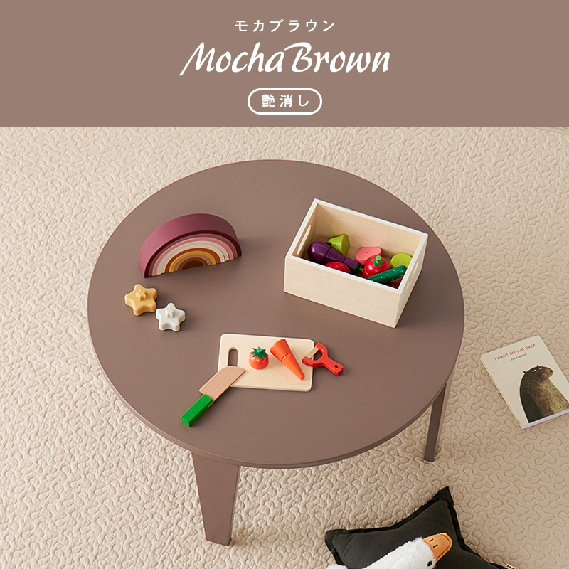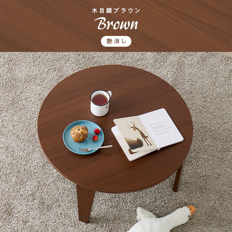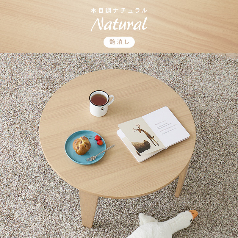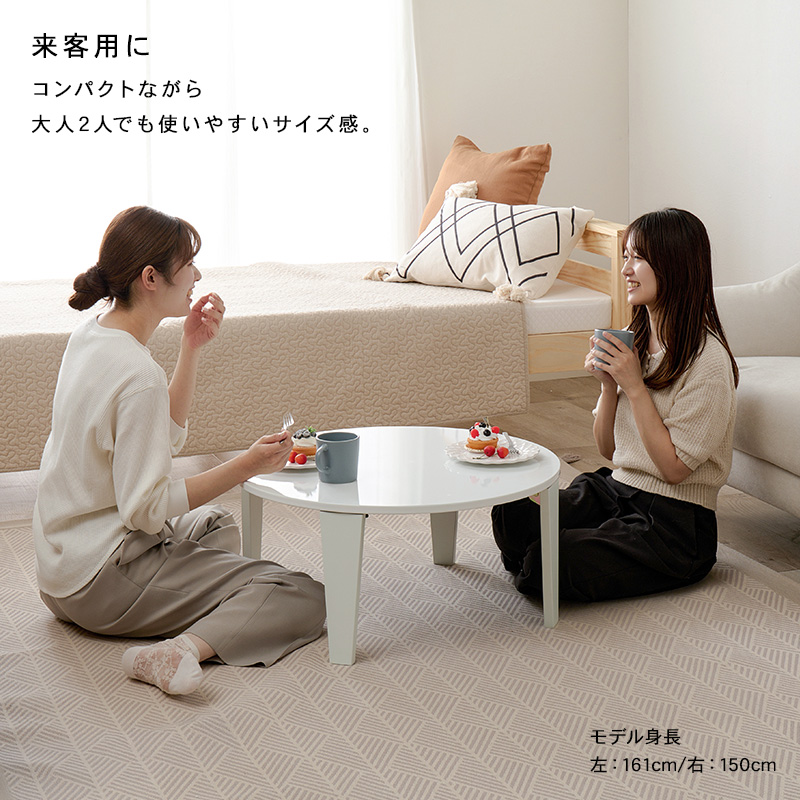くすみカラーやモノトーンカラーが選べ、コンパクトサイズでワンルームや1人部屋にぴったりな円形テーブル。省スペース収納可能な折れ脚タイプ。