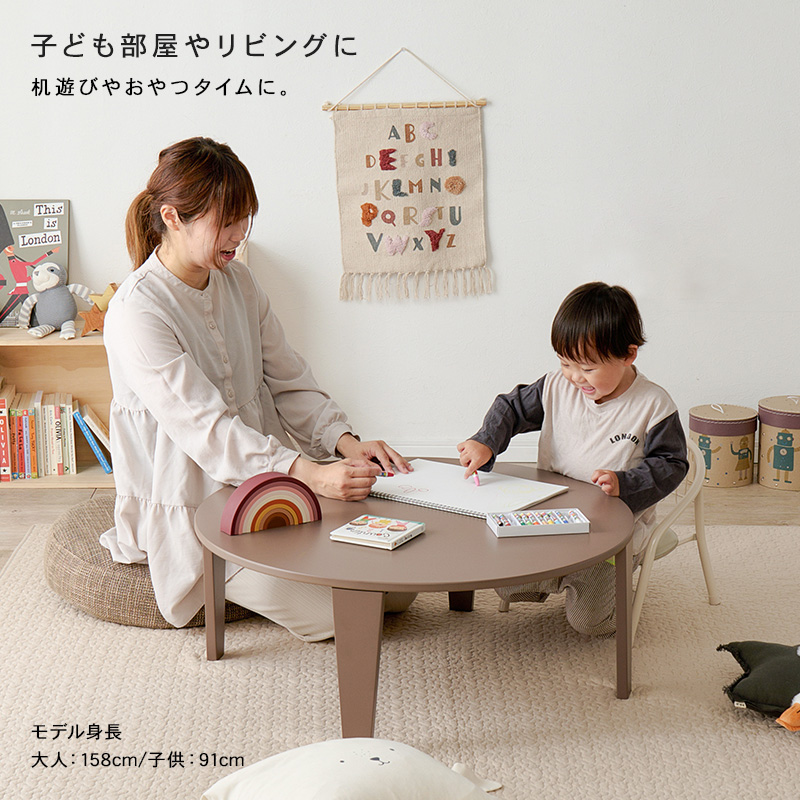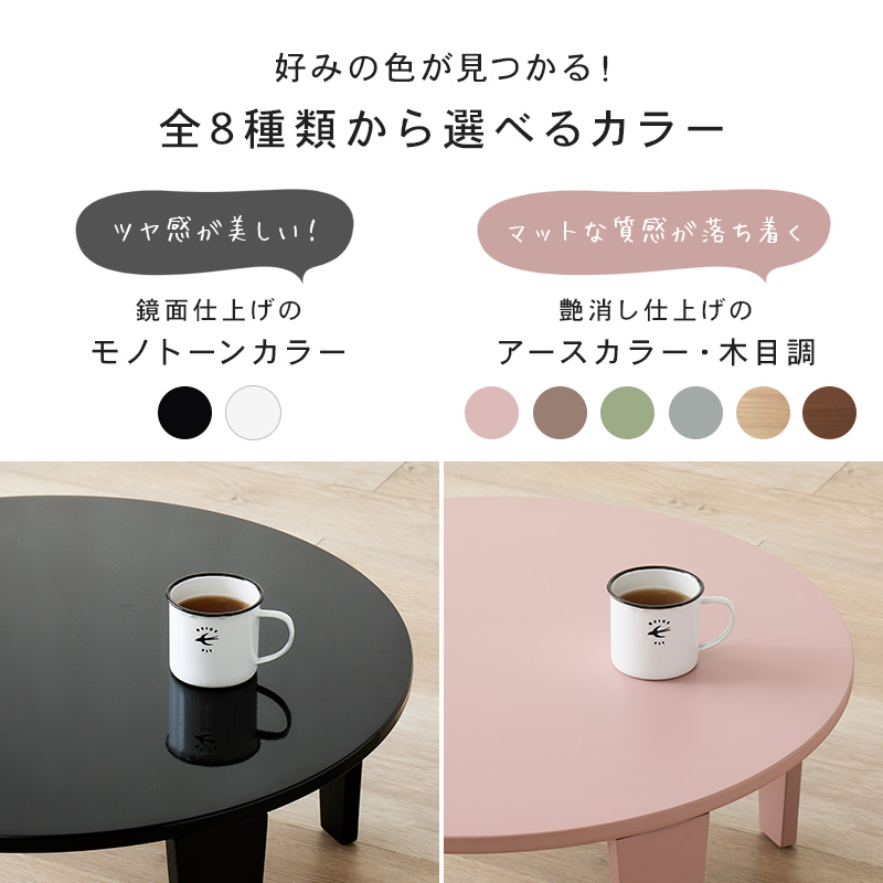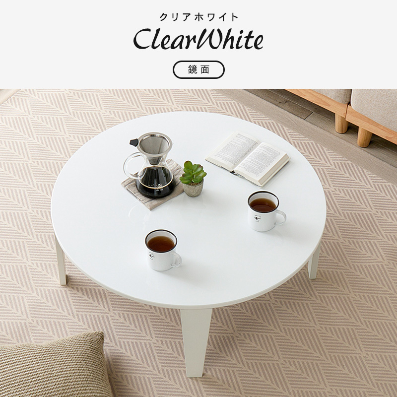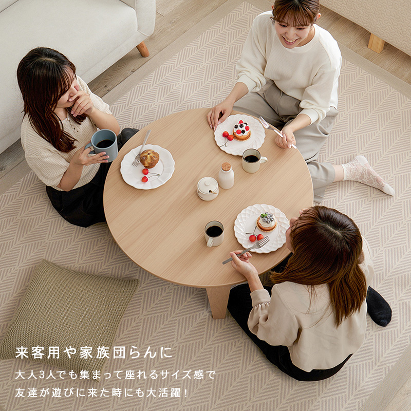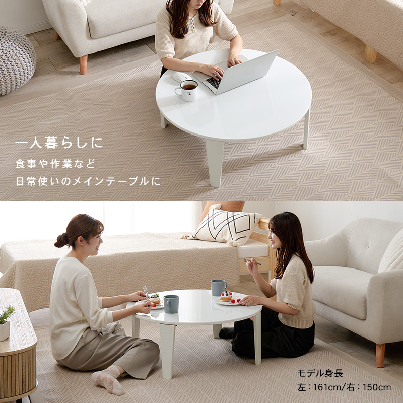 くすみカラーやモノトーンカラーが選べ、来客時や2〜3人でゆったり使える大きめサイズの円形テーブル。省スペース収納可能な折れ脚タイプ。