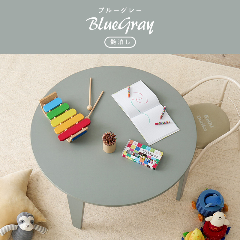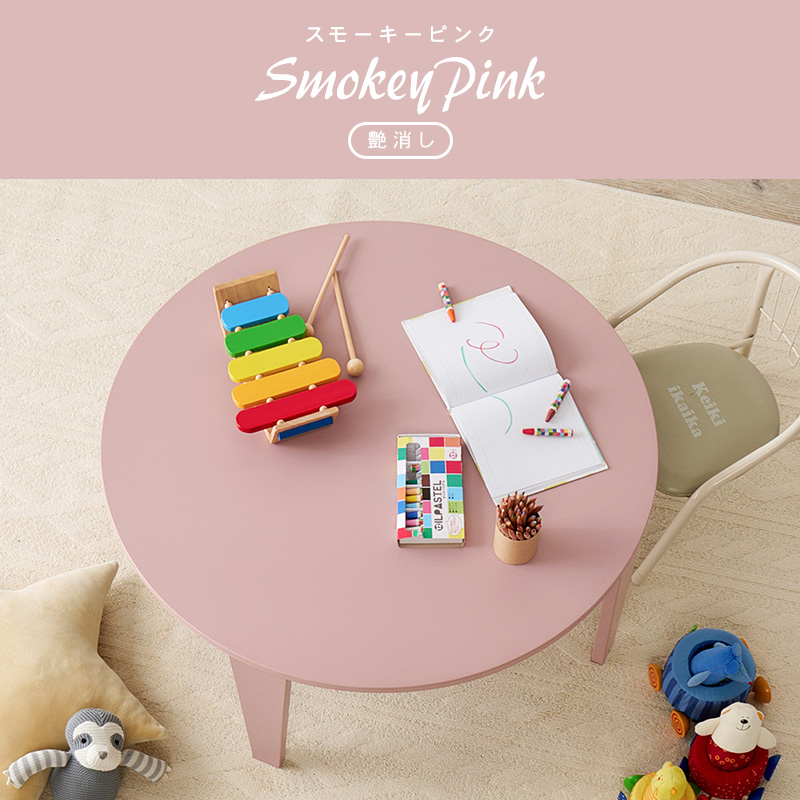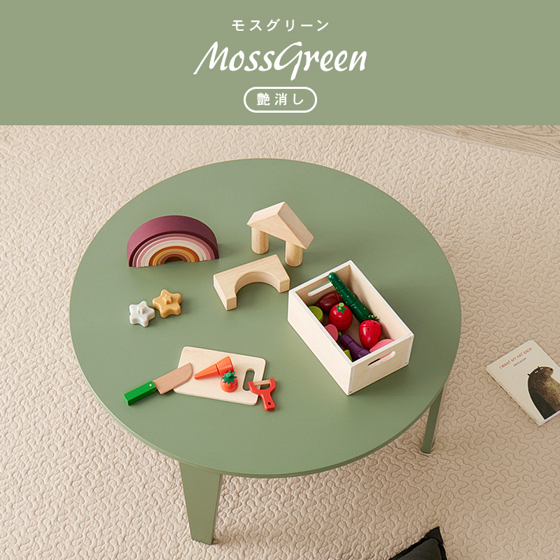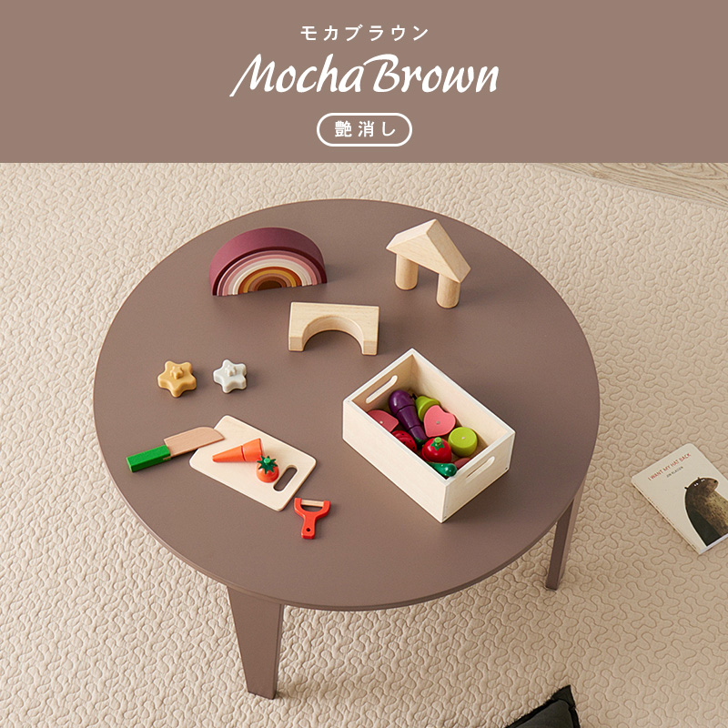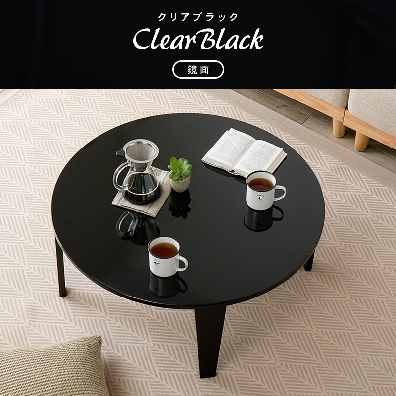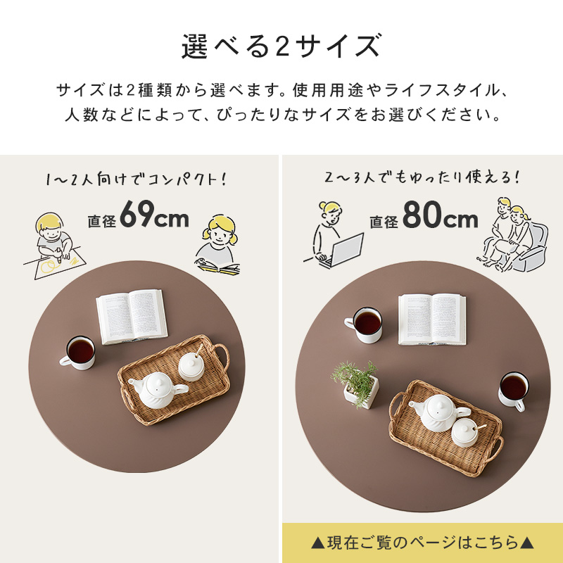 くすみカラーやモノトーンカラーが選べ、来客時や2〜3人でゆったり使える大きめサイズの円形テーブル。省スペース収納可能な折れ脚タイプ。