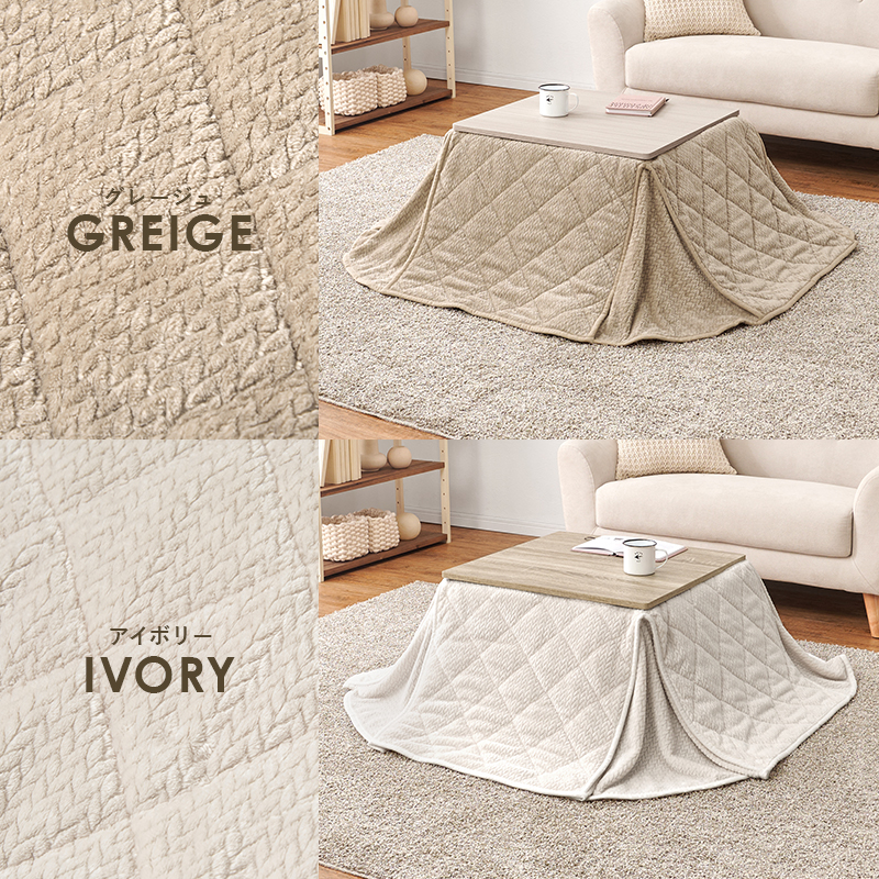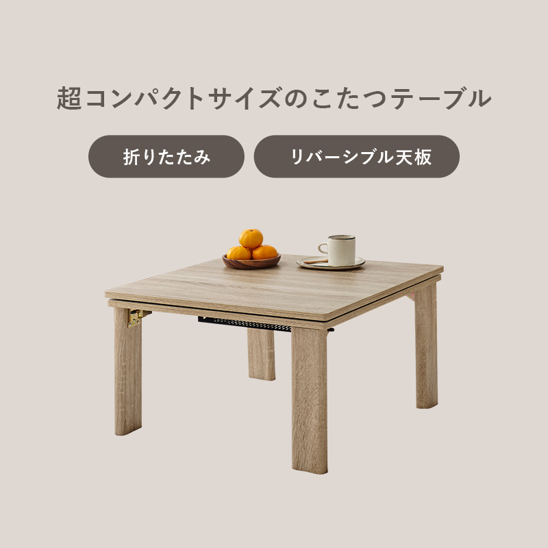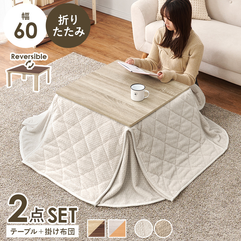 シンプルなデザインで天板リバーシブル、収納に便利な折れ脚コタツ。立体感のあるニット柄の省スペース掛け布団セット。