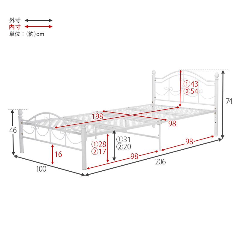 ベッド:(約)幅100×奥行206×高さ74×床面高31/20cm