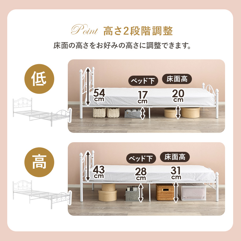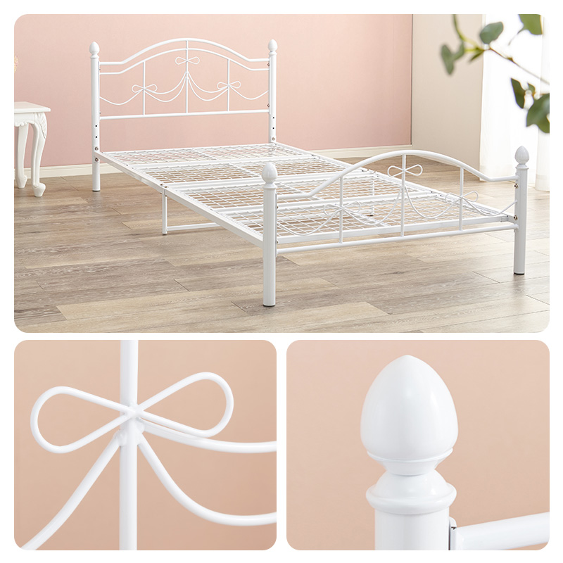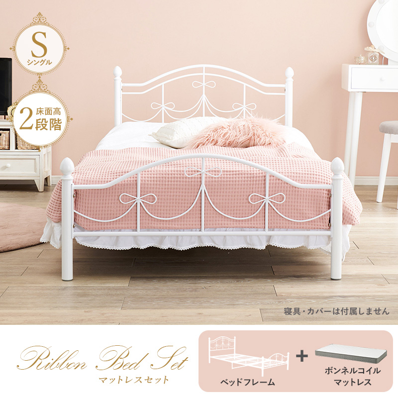 【マットレスセット】リボンの装飾が可愛いシングルベッド ボンネルコイルマットレス付き