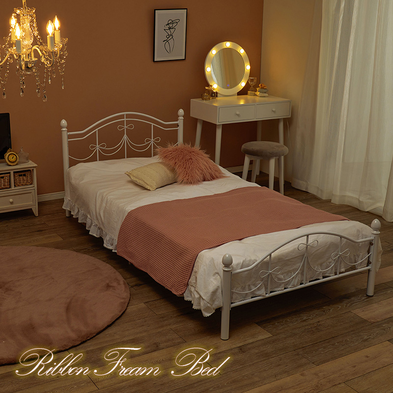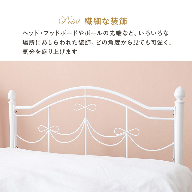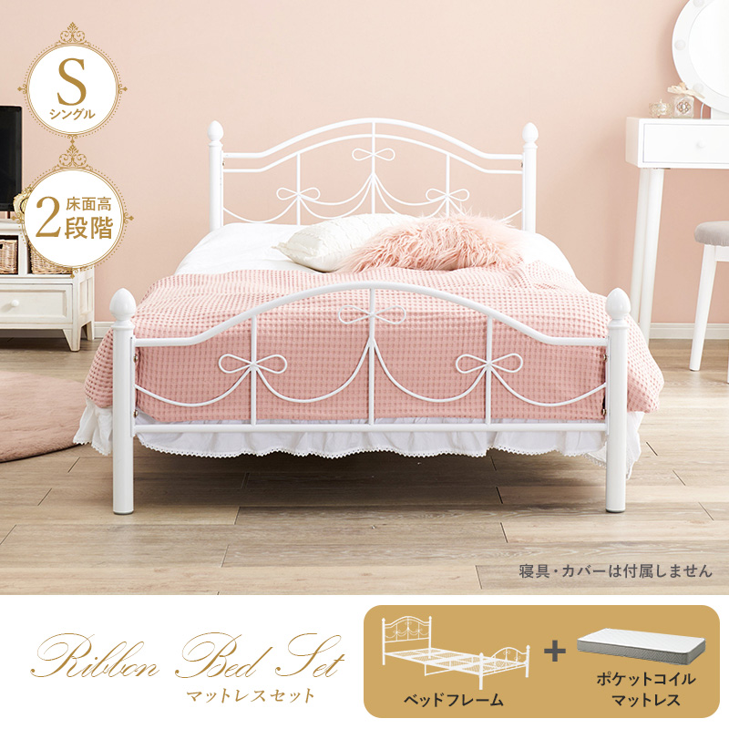 【マットレスセット】リボンの装飾が可愛いシングルベッド ポケットコイルマットレス付き