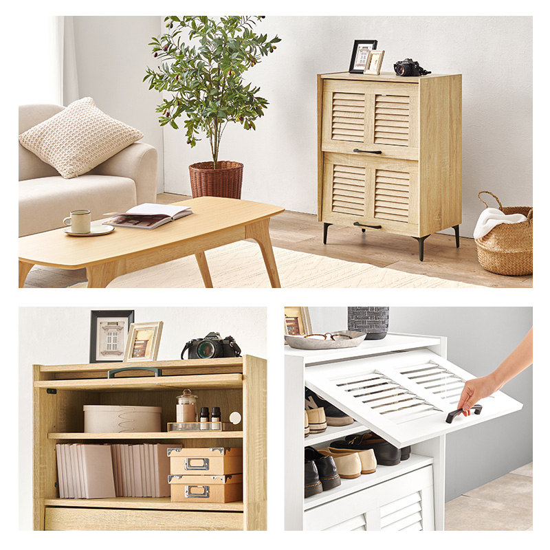扉はルーバー仕様・背面には通気口がある為、通気性抜群。においや湿気がこもりにくく、靴を清潔に収納できます。