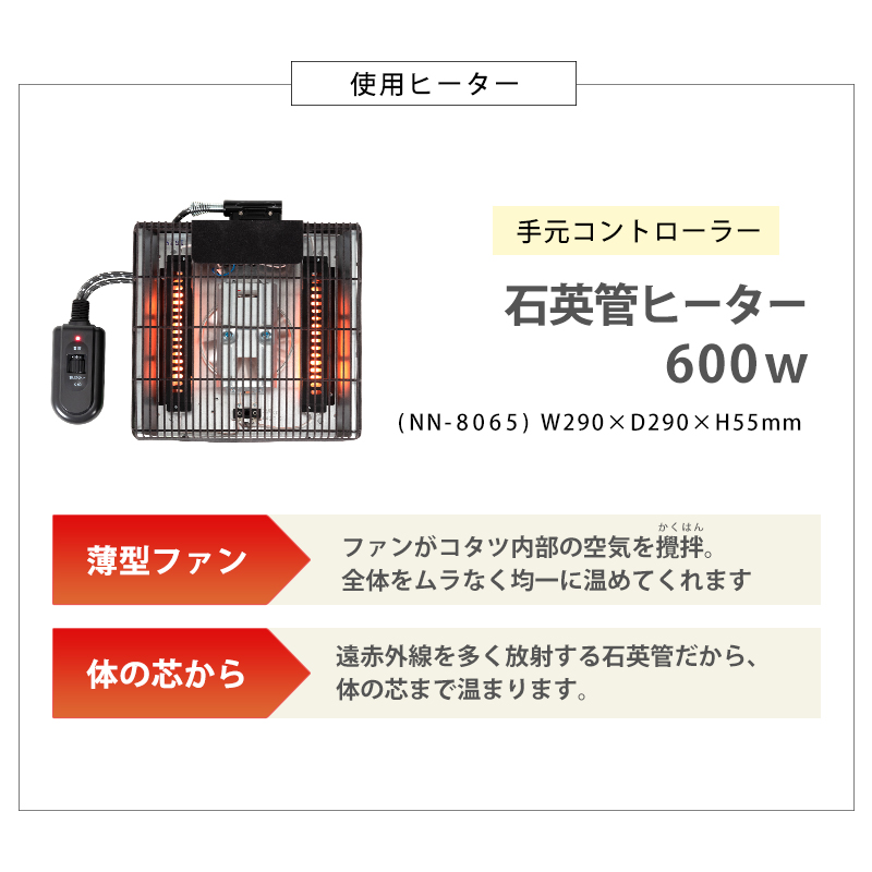 ■ハイパワーで素早く暖まる、600Wの石英管ヒーター付き