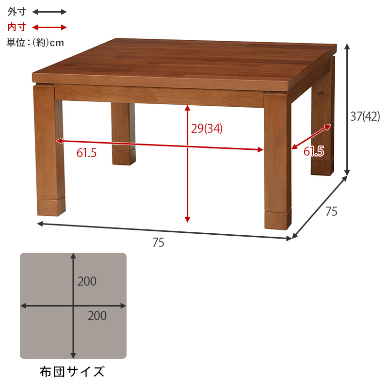 こたつ:(約)幅75×奥行75×高さ37/42cm