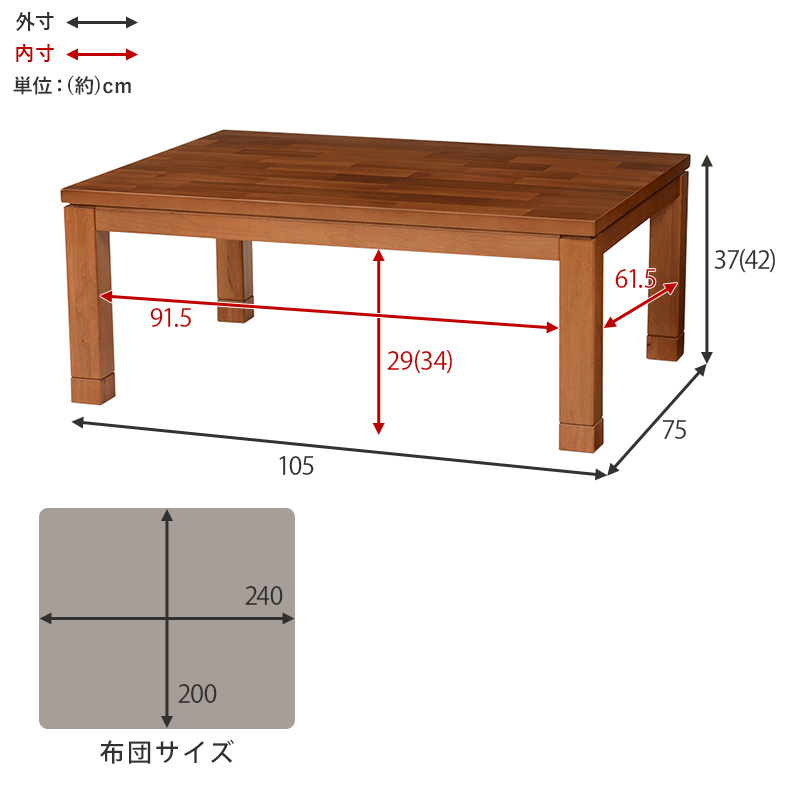 こたつ:(約)幅105×奥行75×高さ37/42cm
