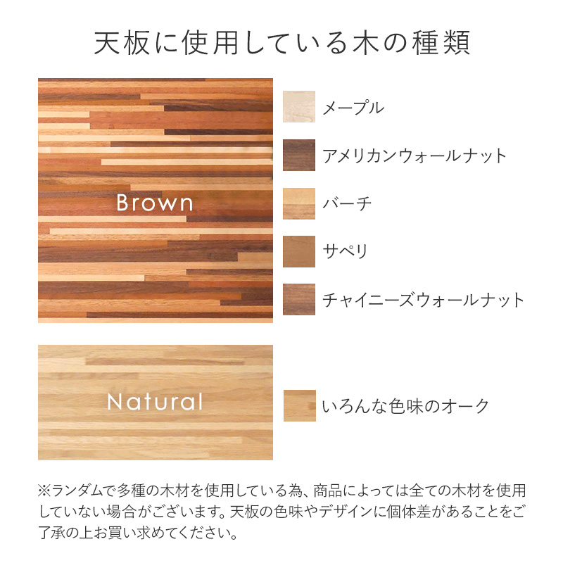 色や木目がそれぞれ異なる多種の木材を、ランダムに使用した天板はお部屋のアクセントに。他にない個性的なデザインをお楽しみいただけます。