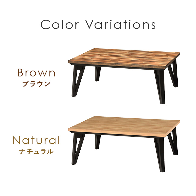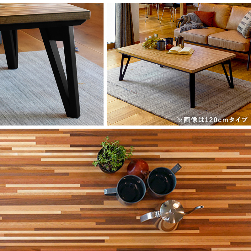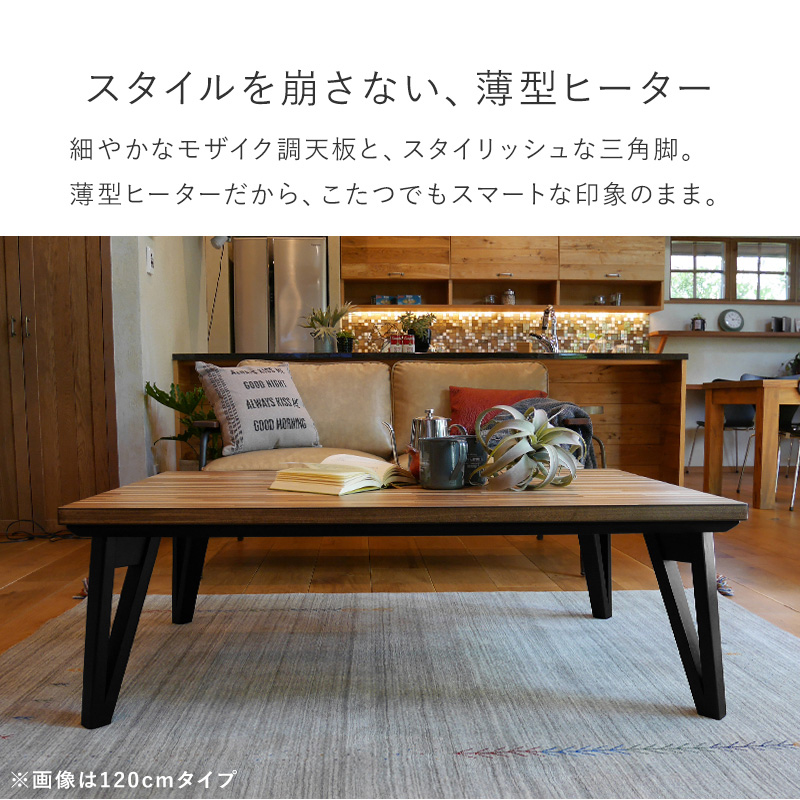 細やかなモザイク調天板と、スタイリッシュな三角脚。薄型ヒーターだから、こたつでもスマートな印象のまま。