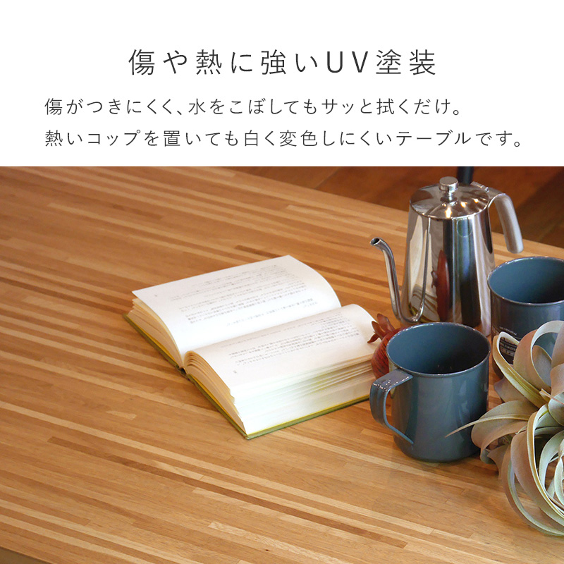 傷が付きにくく、水をこぼしてもサッと拭くだけ。熱いコップを置いても白く変色しにくいテーブルです。