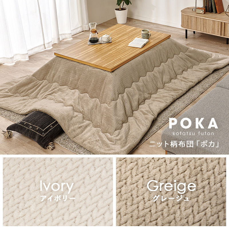 細やかな寄木細工調の天板と三角脚がスタイリッシュなコタツ。立体感のあるニット柄の掛け布団セット。
