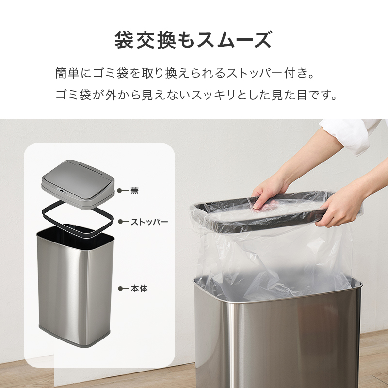 簡単にゴミ袋を取り換えられるストッパー付き。ゴミ袋が外から見えないスッキリとしたデザインです。