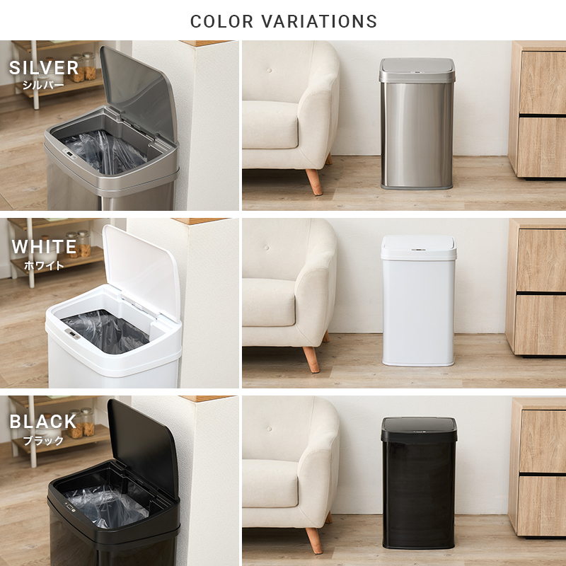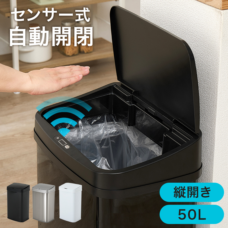 【3色展開】幅38.5cm 50L センサー付き自動開閉ゴミ箱 縦開きタイプ ブラックorホワイトorシルバー