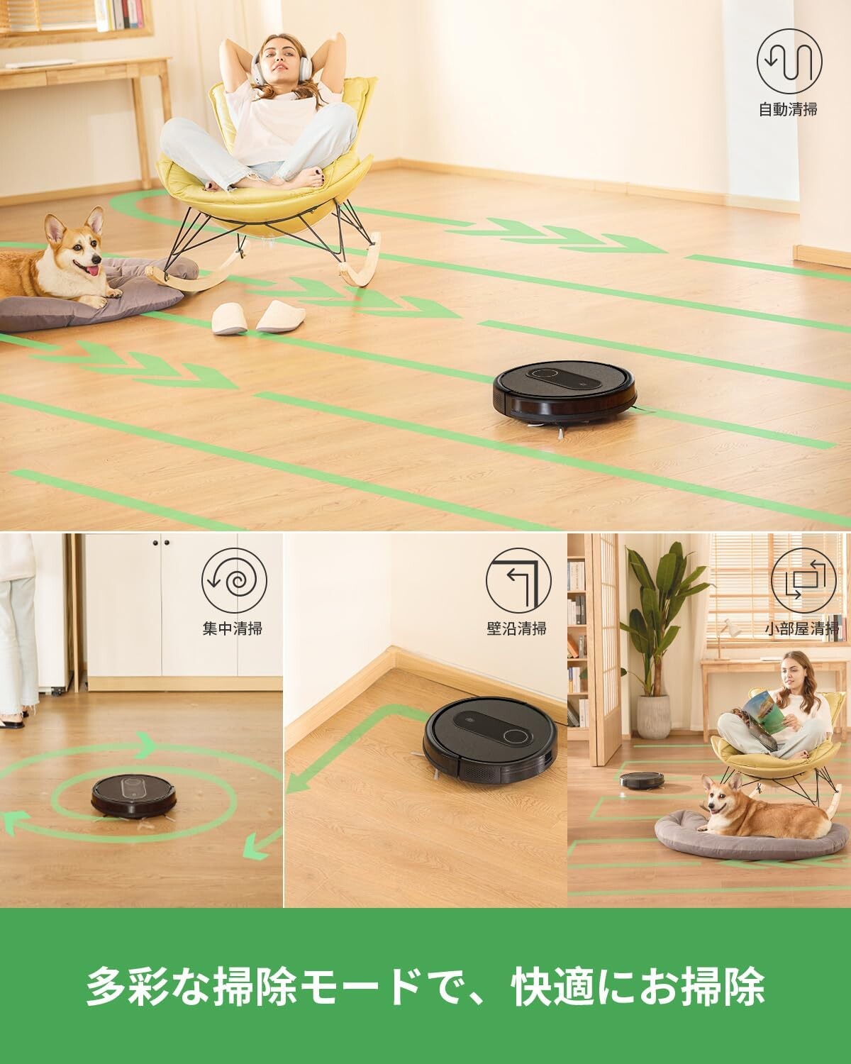 この掃除機は、四つの清掃モードがあります。1自動清掃2集中清掃3壁沿清掃4小部屋清掃。さらに、アプリを使用し、清掃モードや吸引力の強さを自由に切り替えることができます。T7ロボットクリーナーの清掃時間も予約でき、毎日のスケジュール通りにコツコツ清掃できます。